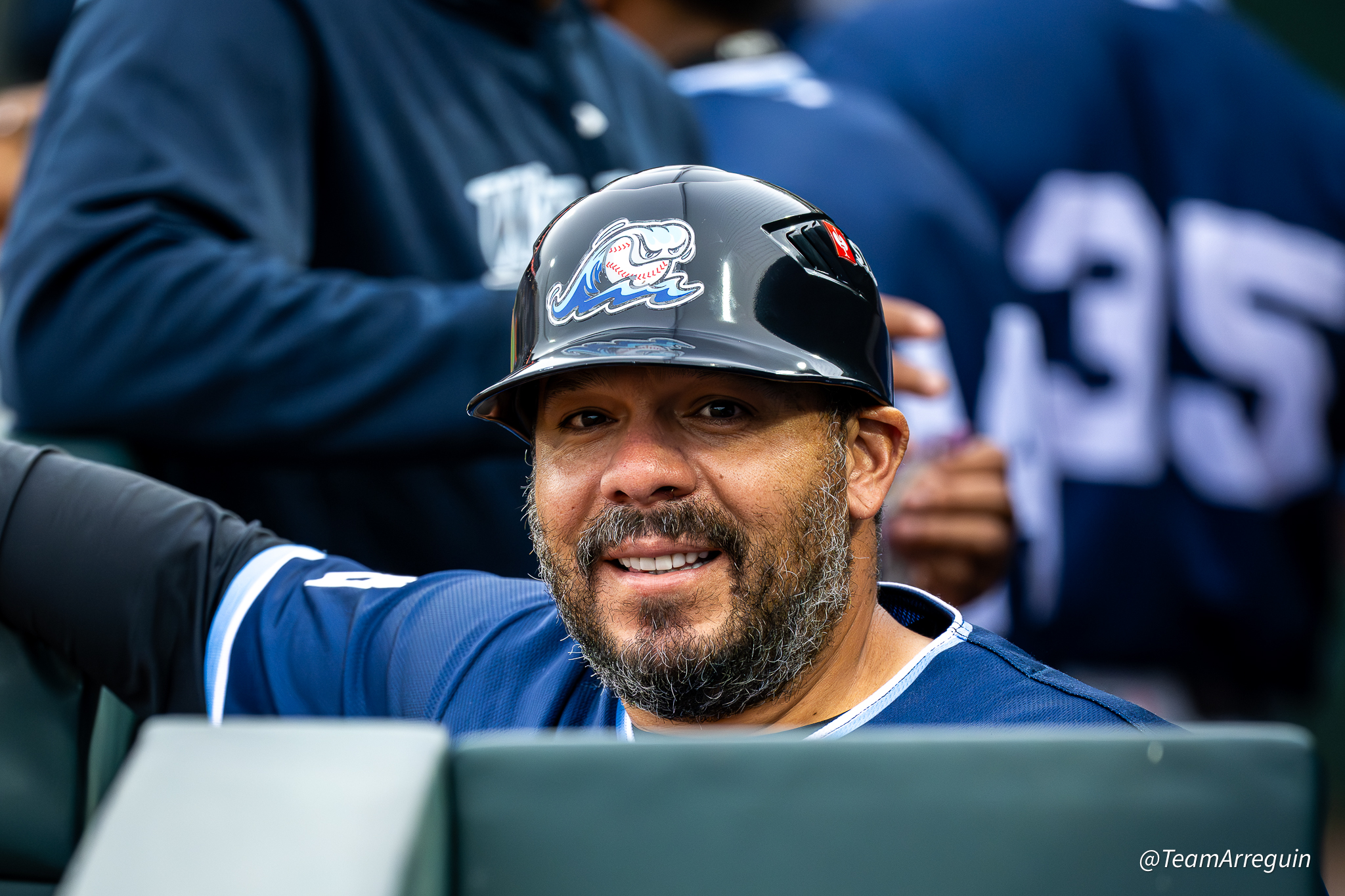 LANSING, MI (4-17-26) — The West Michigan Whitecaps defeated the Lansing Lugnuts 6-4 in the first game of a doubleheader Friday at Jackson Field, extending their winning streak to four games. Whitecaps Head Coach Rene Rivera (#44), smiling after a solid perfomance by his team.